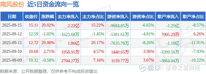 9月15日的资金流向数据方面,主力资金净流入2.22亿元,占总成交额15.22%,游资资金净流出9684.85万元,占总成交额6.65%,散户资金净流出1.25亿元,占总成交额8.57%。