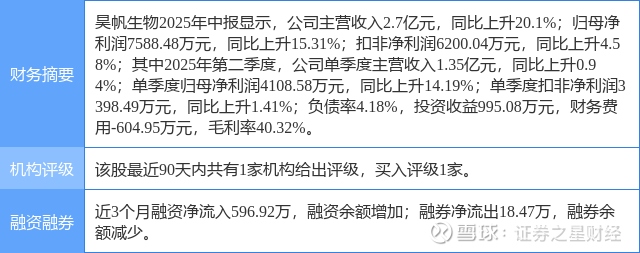 2025年9月3日,开源证券研究员余汝意,汪晋发布了对昊帆生物的研报《公司信息更新报告:下游需求强劲,新产能陆续释放突破供给瓶颈》,该研报对昊帆生物给出“买入”评级。研报中预计2025-2027年公司归母净利润为1.66/2.08/2.68亿元,EPS为1.54/1.93/2.48元,当前股价对应PE为35.2/28.1/21.8倍,鉴于多肽药物领域快速发展以及公司处于行业龙头地位,维持“买入”评级。证券之星数据中心根据近三年发布的研报数据计算,该研报作者对此股的盈利预测准确度为73.6%。