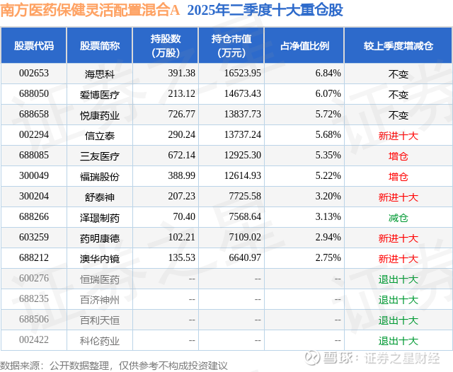 根据2025基金半年报公募基金重仓股数据,重仓该股的公募基金共11家,其中持有数量最多的公募基金为南方基金的南方医药保健灵活配置混合A。南方医药保健灵活配置混合A目前规模为24.05亿元,最新净值2.917(9月12日),较上一交易日下跌0.17%,近一年上涨54.95%。该公募基金现任基金经理为王峥娇。