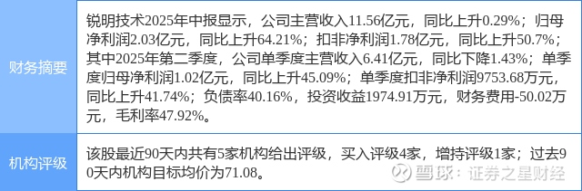 2025年9月2日,太平洋研究员曹佩,王景宜发布了对锐明技术的研报《业绩持续高增,前装业务快速放量》,该研报对锐明技术给出“买入”评级。研报中预计公司2025-2027年营业收入分别为26.34/33.94/42.42亿元,归母净利润分别为4.13/5.53/7.39亿元,维持“买入”评级。证券之星数据中心根据近三年发布的研报数据计算,该研报作者对此股的盈利预测准确度为62.89%。