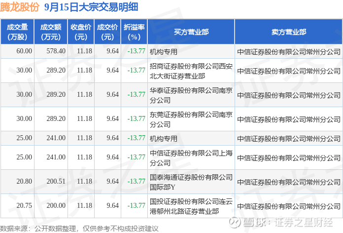 证券之星消息,9月15日腾龙股份发生大宗交易,交易数据如下: