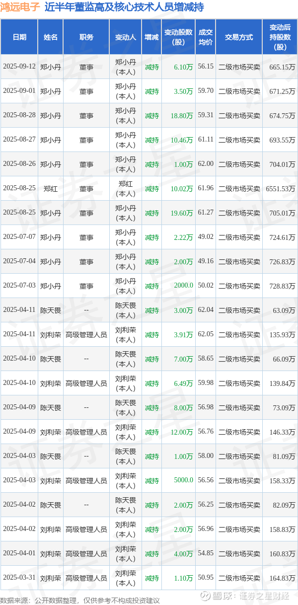 鸿远电子近半年内的董监高及核心技术人员增减持详情如下: