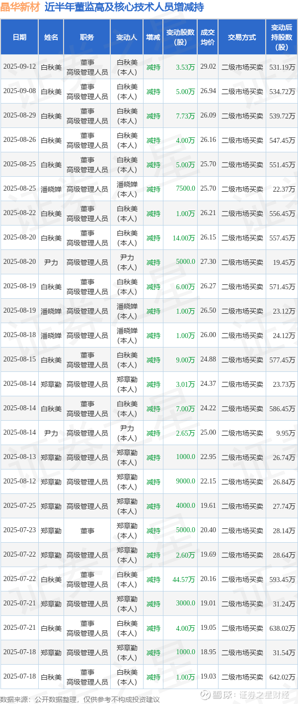 晶华新材近半年内的董监高及核心技术人员增减持详情如下: