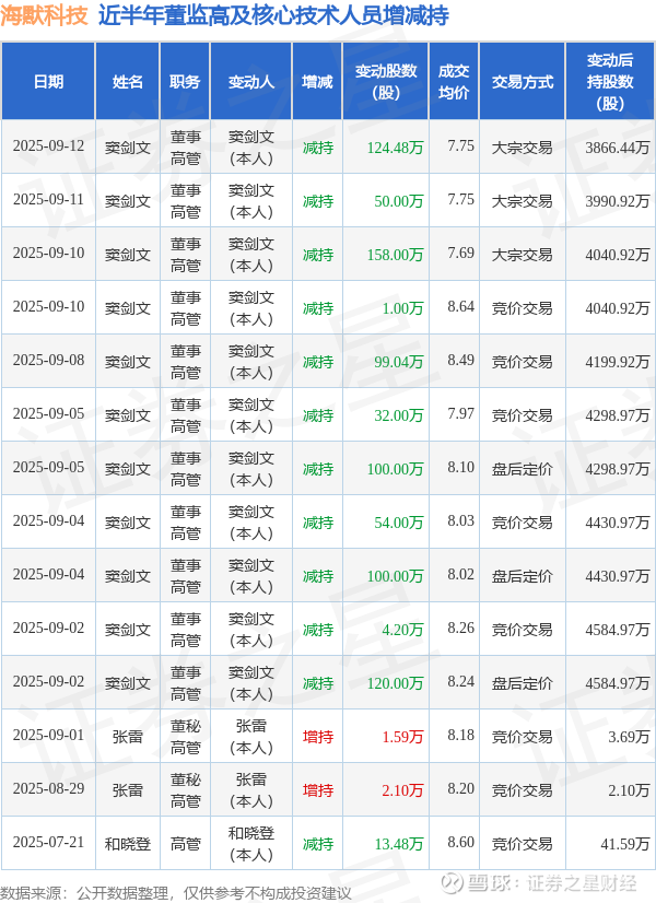 证券之星消息,根据9月15日市场公开信息、上市公司公告及交易所披露数据整理,海默科技(300084)最新董监高及相关人员股份变动情况:2025年9月12日公司董事,高管窦剑文共减持公司股份124.48万股,占公司总股本为0.244%。变动期间公司股价上涨1.63%,9月12日当日收盘报8.75元。