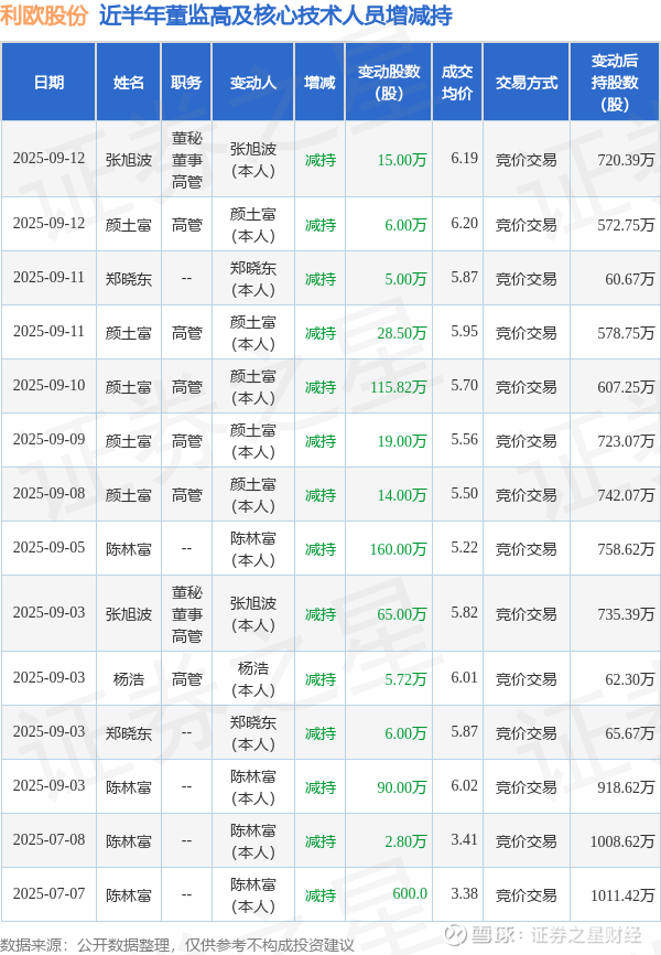 利欧股份近半年内的董监高及核心技术人员增减持详情如下: