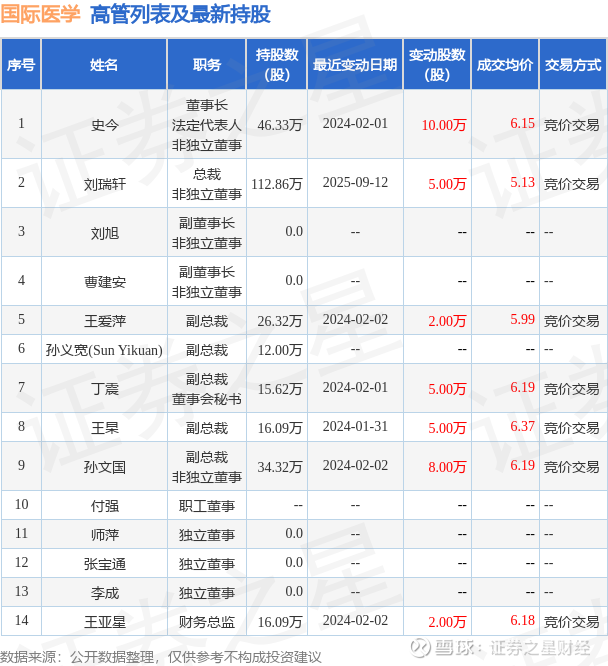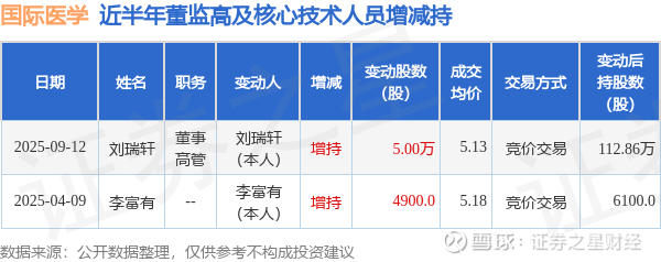 国际医学近半年内的董监高及核心技术人员增减持详情如下: