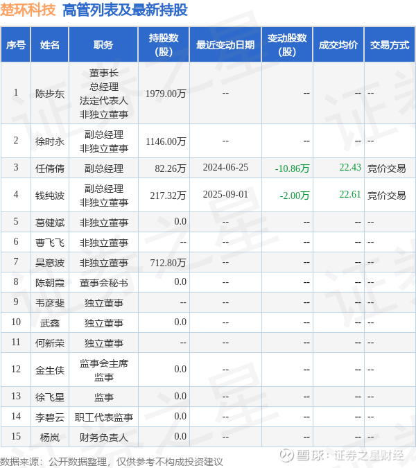 证券之星消息,根据9月15日市场公开信息、上市公司公告及交易所披露数据整理,楚环科技(001336)最新董监高及相关人员股份变动情况:2025年9月12日公司董事,高管钱纯波共减持公司股份6400.0股,占公司总股本为0.008%。变动期间公司股价下跌0.82%,9月12日当日收盘报23.11元。