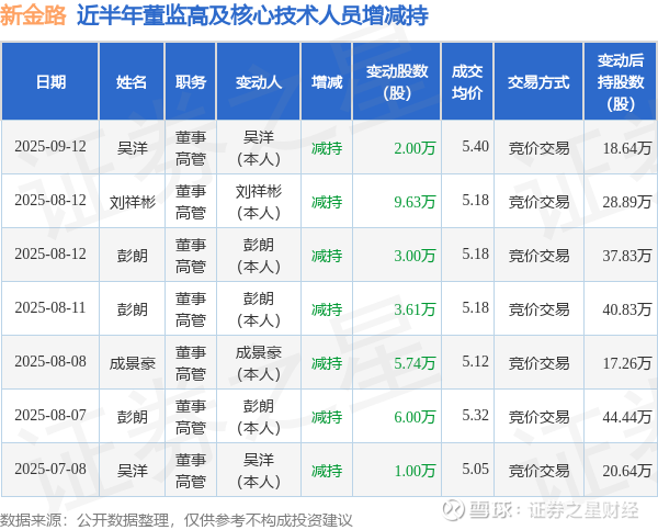 新金路近半年内的董监高及核心技术人员增减持详情如下: