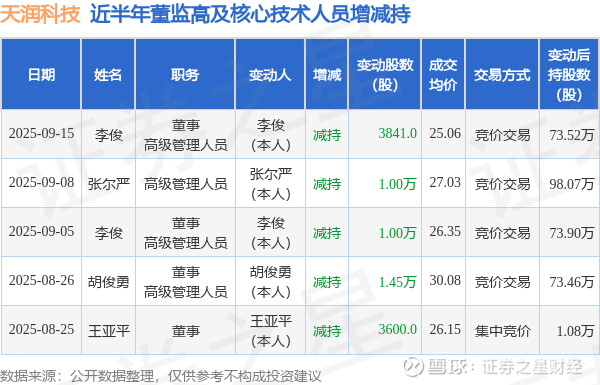证券之星消息,根据9月16日市场公开信息、上市公司公告及交易所披露数据整理,天润科技(430564)最新董监高及相关人员股份变动情况:2025年9月15日公司董事,高级管理人员李俊共减持公司股份3841.0股,占公司总股本为0.0043%。变动期间公司股价下跌0.32%,9月15日当日收盘报25.03元。