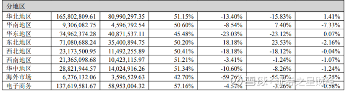 今年上半年,亚冬会的举办带动了东北地区对户外装备的刚性需求,报告期内,探路者来自东北地区的收入同比大幅增长18.18%,而来自华北、华东、华南等国内六大地区以及海外市场和电商的收入均呈现不同程度的下滑;电商渠道和海外市场收入分别同比下滑4.57%和59.76%。