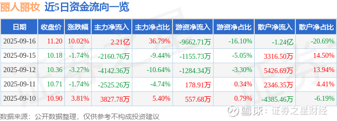 证券之星消息,丽人丽妆9月16日涨停收盘,收盘价11.2元。该股于9点43分涨停,4次打开涨停,截止收盘封单资金为4727.18万元,占其流通市值1.05%。