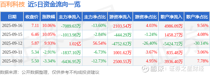 证券之星消息,百利科技9月16日涨停收盘,收盘价7.11元。该股于9点25分涨停,2次打开涨停,截止收盘封单资金为5374.18万元,占其流通市值1.54%。