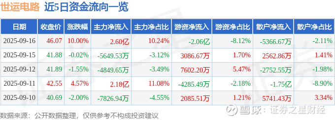 证券之星消息,世运电路9月16日涨停收盘,收盘价46.07元。该股于9点45分涨停,3次打开涨停,截止收盘封单资金为9894.68万元,占其流通市值0.3%。