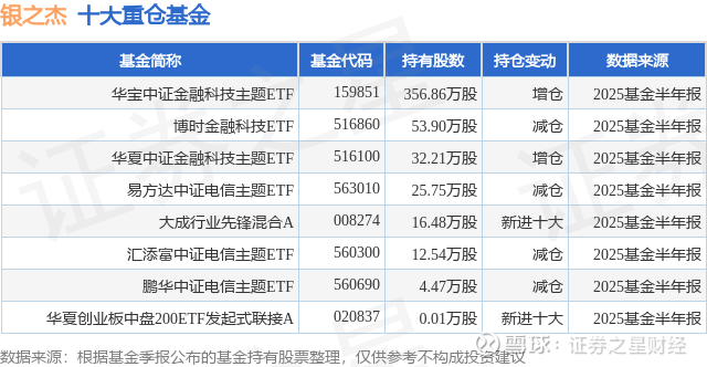 根据2025基金半年报公募基金重仓股数据,重仓该股的公募基金共8家,其中持有数量最多的公募基金为华宝基金的华宝中证金融科技主题ETF。华宝中证金融科技主题ETF目前规模为57.31亿元,最新净值0.9324(9月15日),较上一交易日下跌0.21%,近一年上涨153.85%。该公募基金现任基金经理为陈建华 曹旭辰。陈建华在任的基金产品包括:华宝中证A100ETF联接A,管理时间为2012年12月22日至今,期间收益率为166.04%;华宝化工ETF,管理时间为2021年2月26日至今,期间收益率为-25.46%;华宝有色金属ETF,管理时间为2021年3月12日至今,期间收益率为60.28%。曹旭辰在任的基金产品包括:华宝国证通用航空产业ETF,管理时间为2025年5月22日至今,期间收益率为13.34%;华宝创业板人工智能ETF,管理时间为2025年5月22日至今,期间收益率为88.5%;华宝中证港股通互联网ETF,管理时间为2025年5月22日至今,期间收益率为18.39%;华宝中证电子50ETF,管理时间为2025年5月22日至今,期间收益率为47.82%。