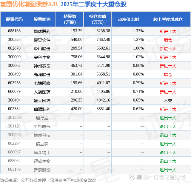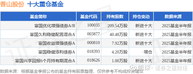 根据2025基金半年报公募基金重仓股数据,重仓该股的公募基金共5家,其中持有数量最多的公募基金为富国基金的富国优化增强债券A/B。富国优化增强债券A/B目前规模为19.99亿元,最新净值2.1(9月15日),较上一交易日下跌0.33%,近一年上涨46.96%。该公募基金现任基金经理为刘兴旺。刘兴旺在任的基金产品包括:富国裕利债券A,管理时间为2022年7月28日至今,期间收益率为13.83%;富国双利增强债券A,管理时间为2022年9月26日至今,期间收益率为11.37%;富国久利稳健配置混合A,管理时间为2022年12月8日至今,期间收益率为57.98%;