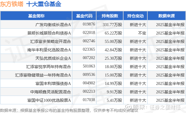 根据2025基金半年报公募基金重仓股数据,重仓该股的公募基金共12家,其中持有数量最多的公募基金为广发基金的广发均衡成长混合A。广发均衡成长混合A目前规模为2.59亿元,最新净值1.5417(9月15日),较上一交易日上涨0.16%,近一年上涨61.5%。该公募基金现任基金经理为杨冬。杨冬在任的基金产品包括:广发多因子混合,管理时间为2021年7月2日至今,期间收益率为56.31%;广发瑞誉一年持有期混合A,管理时间为2022年1月19日至今,期间收益率为61.78%;广发价值领航一年持有混合A,管理时间为2022年6月2日至今,期间收益率为99.26%;广发东财大数据精选混合A,管理时间为2023年8月21日至今,期间收益率为43.61%。