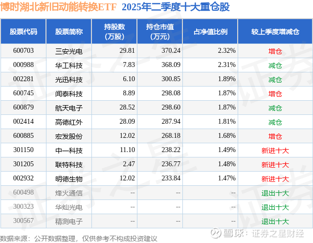 根据2025基金半年报公募基金重仓股数据,重仓该股的公募基金共1家,其中持有数量最多的公募基金为博时基金的博时湖北新旧动能转换ETF。博时湖北新旧动能转换ETF目前规模为1.59亿元,最新净值1.1228(9月15日),较上一交易日上涨0.08%,近一年上涨78.56%。该公募基金现任基金经理为尹浩。尹浩在任的基金产品包括:博时创业板ETF联接A,管理时间为2019年10月11日至今,期间收益率为86.95%;博时创业板ETF,管理时间为2019年10月11日至今,期间收益率为94.83%;博时中证5G产业50ETF,管理时间为2020年3月27日至今,期间收益率为108.46%;博时新能源汽车ETF,管理时间为2020年12月10日至今,期间收益率为9.88%。