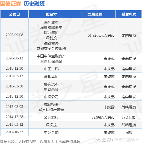 证券之星消息,根据天眼查APP于9月8日公布的信息整理,国信证券股份有限公司定向增发融资,融资额51.92亿元人民币,参与投资的机构包括深圳资本,深圳鲲鹏资本,深业集团,深创投,远致富海,成都交子金控集团。