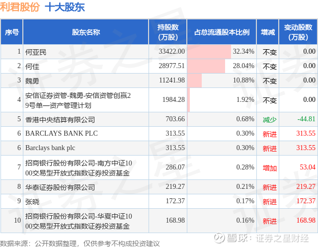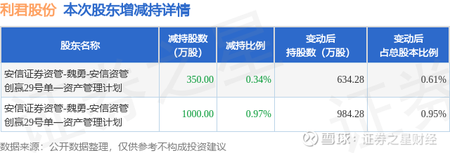 证券之星消息,9月16日利君股份发布公告《利君股份:关于持股5%以上股东减持股份超过1%的公告》,其股东安信证券资管-魏勇-安信资管创赢29号单一资产管理计划于2025年9月8日至2025年9月16日间合计减持1350.0万股,占公司目前总股本的1.3063%,变动期间该股股价下跌1.67%,截止9月16日收盘报11.77元。