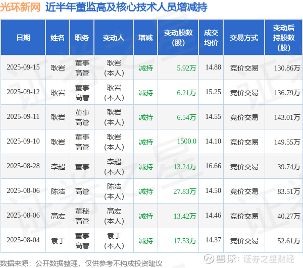 证券之星消息,根据9月16日市场公开信息、上市公司公告及交易所披露数据整理,光环新网(300383)最新董监高及相关人员股份变动情况:2025年9月15日公司董事,高管耿岩共减持公司股份5.92万股,占公司总股本为0.0033%。变动期间公司股价下跌1.32%,9月15日当日收盘报15.0元。