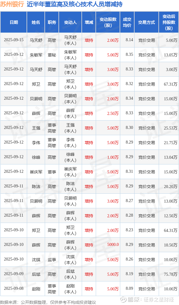证券之星消息,根据9月16日市场公开信息、上市公司公告及交易所披露数据整理,苏州银行(002966)最新董监高及相关人员股份变动情况:2025年9月15日公司高管马天舒共增持公司股份2.0万股,占公司总股本为0.0004%。变动期间公司股价下跌1.58%,9月15日当日收盘报8.1元。