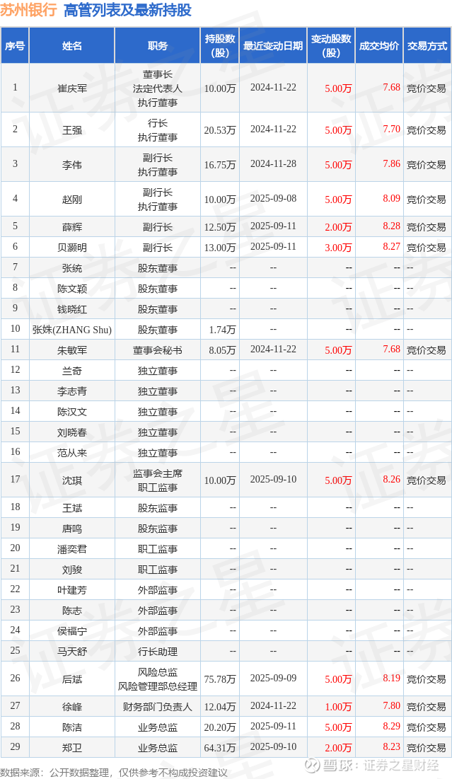 苏州银行近半年内的董监高及核心技术人员增减持详情如下: