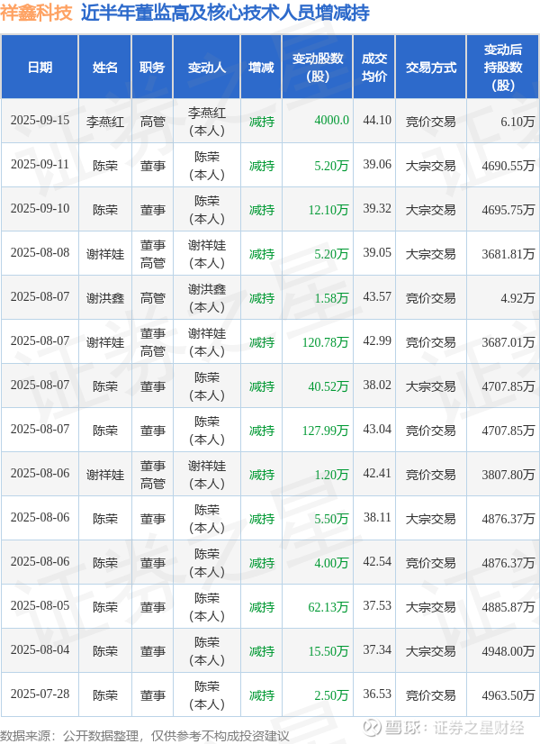 祥鑫科技近半年内的董监高及核心技术人员增减持详情如下: