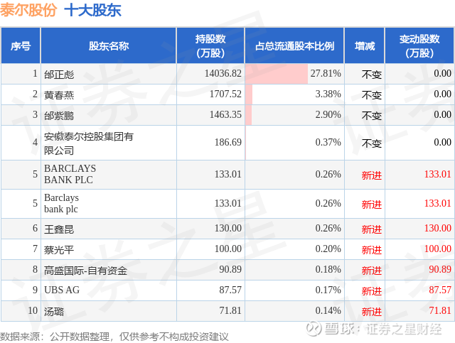 根据泰尔股份2025年中报公布的十大股东详情如下: