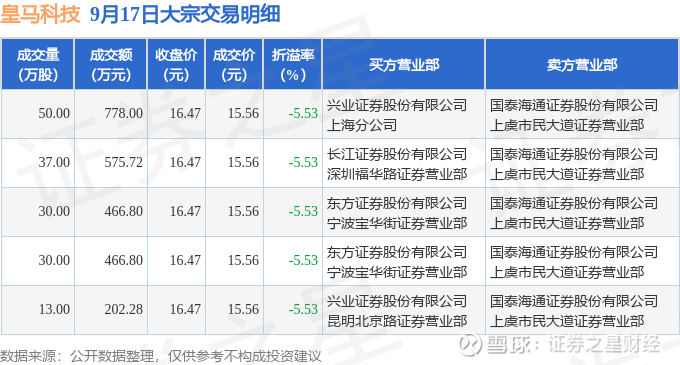 证券之星消息,9月17日皇马科技发生大宗交易,交易数据如下:
