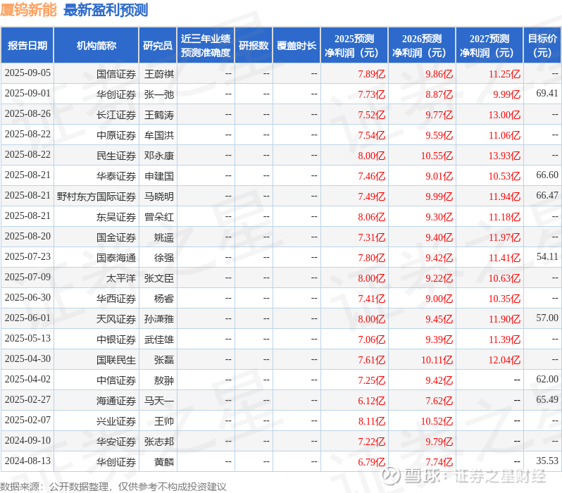 最新盈利预测明细如下: