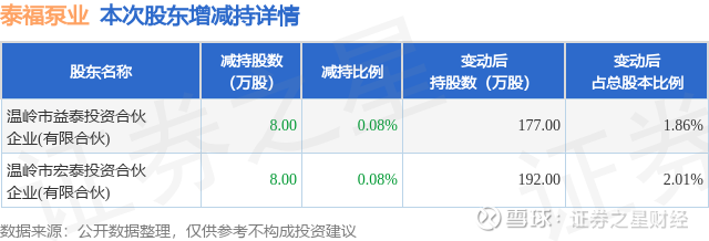 证券之星消息,9月17日泰福泵业发布公告《泰福泵业:关于控股股东、实际控制人及其一致行动人权益变动触及1%整数倍的提示性公告》,其股东温岭市益泰投资合伙企业(有限合伙)、温岭市宏泰投资合伙企业(有限合伙)于2025年9月2日至2025年9月16日间合计减持16.0万股,占公司目前总股本的0.1678%,变动期间该股股价下跌8.71%,截止9月16日收盘报26.32元。