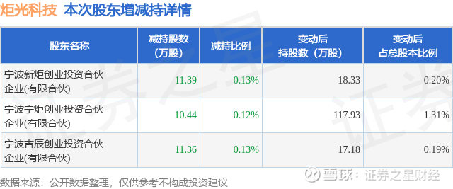 证券之星消息,9月17日炬光科技发布公告《炬光科技:西安炬光科技股份有限公司股东减持股份结果公告》,其股东宁波新炬创业投资合伙企业(有限合伙)、宁波宁炬创业投资合伙企业(有限合伙)、宁波吉辰创业投资合伙企业(有限合伙)于2025年9月13日至2025年9月17日间合计减持33.19万股,占公司目前总股本的0.3694%,变动期间该股股价上涨11.37%,截止9月17日收盘报175.97元。