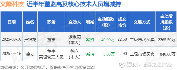 艾隆科技近半年内的董监高及核心技术人员增减持详情如下: