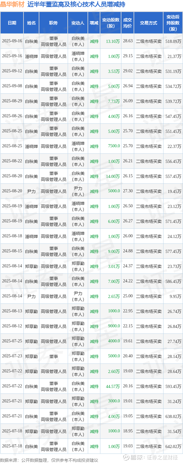 晶华新材近半年内的董监高及核心技术人员增减持详情如下: