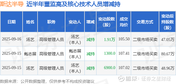 证券之星消息,根据9月17日市场公开信息、上市公司公告及交易所披露数据整理,斯达半导(603290)最新董监高及相关人员股份变动情况:2025年9月16日公司高级管理人员汤艺共减持公司股份1.91万股,占公司总股本为0.008%。变动期间公司股价上涨0.49%,9月16日当日收盘报105.66元。