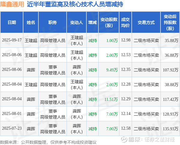 隆鑫通用近半年内的董监高及核心技术人员增减持详情如下: