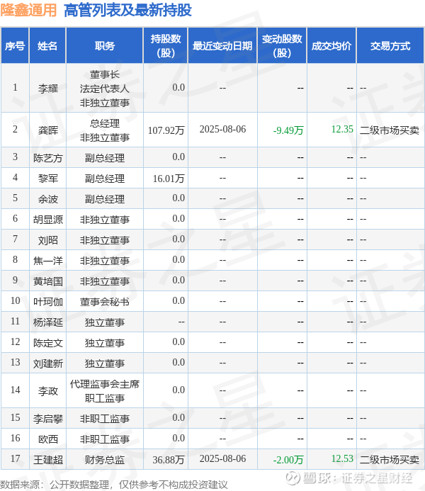 证券之星消息,根据9月17日市场公开信息、上市公司公告及交易所披露数据整理,隆鑫通用(603766)最新董监高及相关人员股份变动情况:2025年9月17日公司高级管理人员王建超共减持公司股份1.0万股,占公司总股本为0.0005%。变动期间公司股价上涨6.74%,9月17日当日收盘报12.99元。