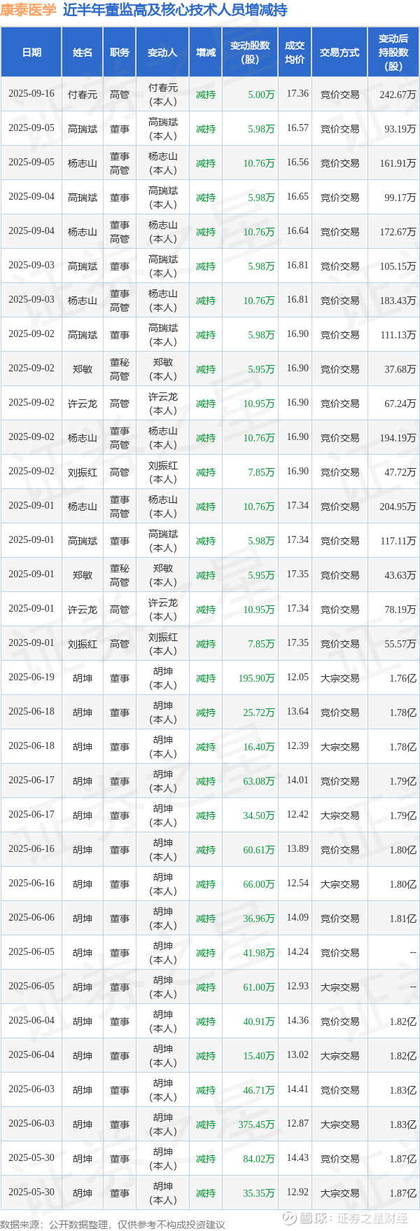 康泰医学近半年内的董监高及核心技术人员增减持详情如下: