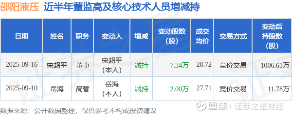 证券之星消息,根据9月17日市场公开信息、上市公司公告及交易所披露数据整理,邵阳液压(301079)最新董监高及相关人员股份变动情况:2025年9月16日公司董事宋超平共减持公司股份7.34万股,占公司总股本为0.0674%。变动期间公司股价上涨3.02%,9月16日当日收盘报28.7元。