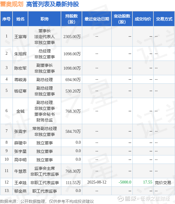 证券之星消息,根据9月17日市场公开信息、上市公司公告及交易所披露数据整理,蕾奥规划(300989)最新董监高及相关人员股份变动情况:2025年9月16日公司监事王卓娃共减持公司股份1.0万股,占公司总股本为0.0047%。变动期间公司股价上涨5.73%,9月16日当日收盘报17.89元。