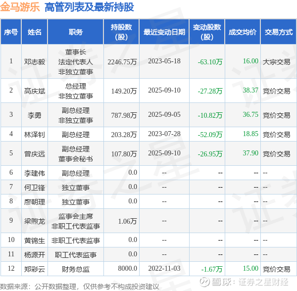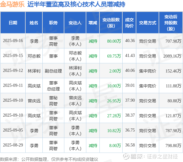 金马游乐近半年内的董监高及核心技术人员增减持详情如下:
