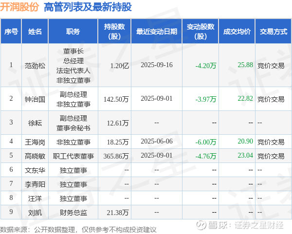 证券之星消息,根据9月17日市场公开信息、上市公司公告及交易所披露数据整理,开润股份(300577)最新董监高及相关人员股份变动情况:2025年9月16日公司董事,高管范劲松共减持公司股份4.2万股,占公司总股本为0.0175%。变动期间公司股价上涨3.94%,9月16日当日收盘报25.32元。