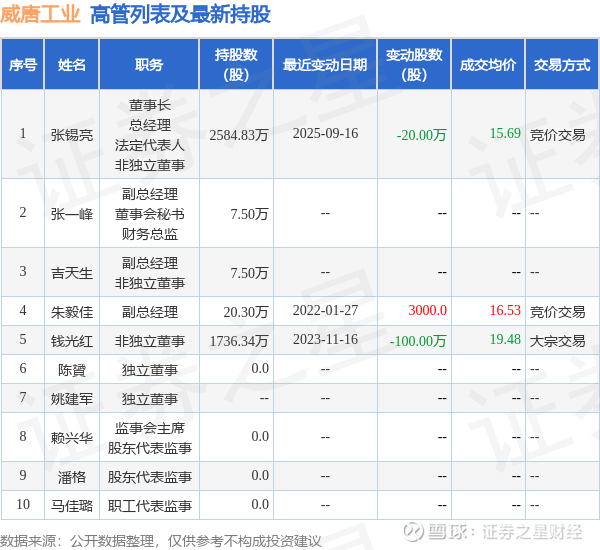威唐工业的高管列表及最新持股情况如下: