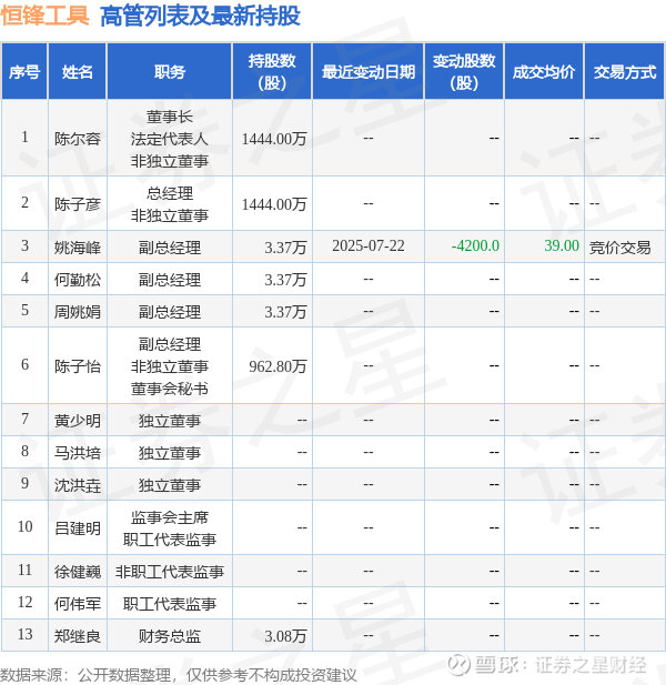 恒锋工具近半年内的董监高及核心技术人员增减持详情如下: