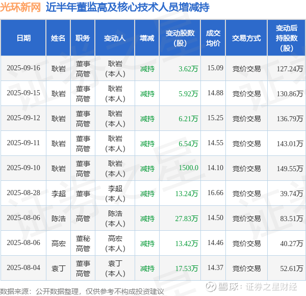 光环新网近半年内的董监高及核心技术人员增减持详情如下: