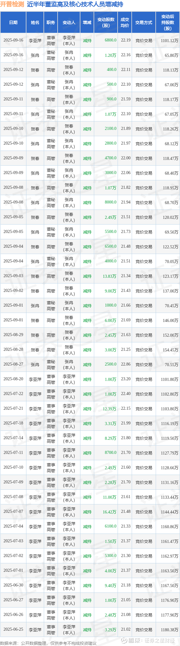 开普检测近半年内的董监高及核心技术人员增减持详情如下:
