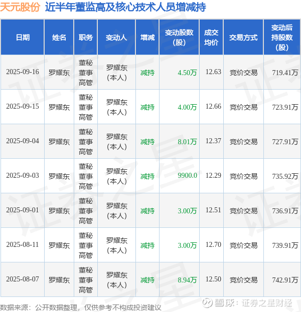 天元股份近半年内的董监高及核心技术人员增减持详情如下: