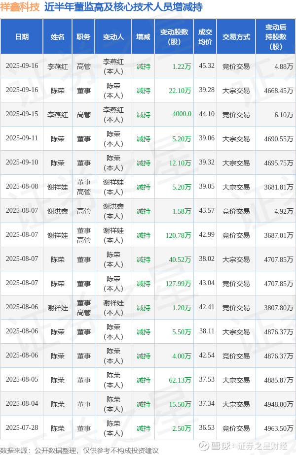 祥鑫科技近半年内的董监高及核心技术人员增减持详情如下: