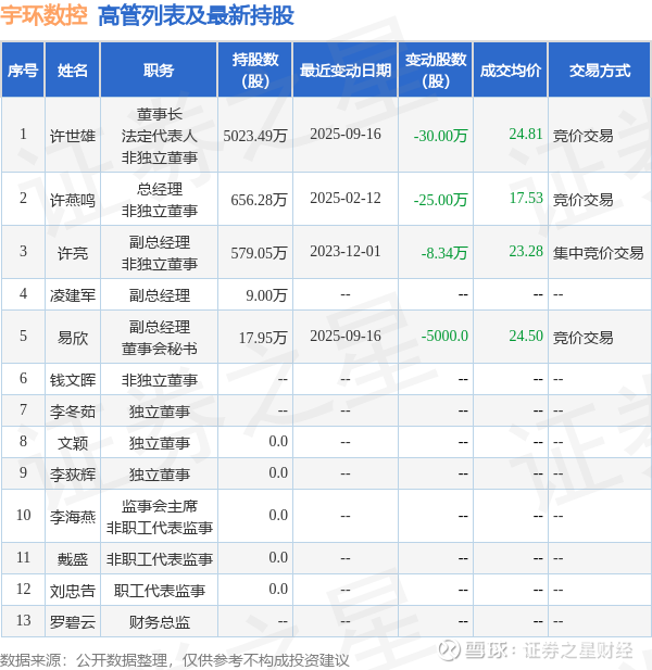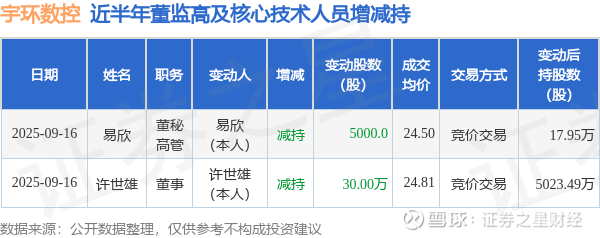 宇环数控近半年内的董监高及核心技术人员增减持详情如下: