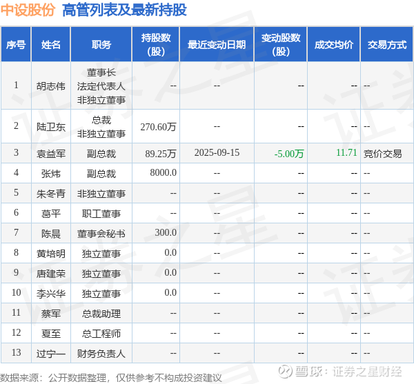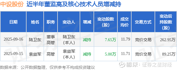 证券之星消息,根据9月17日市场公开信息、上市公司公告及交易所披露数据整理,中设股份(002883)最新董监高及相关人员股份变动情况:2025年9月16日公司董事,高管陆卫东共减持公司股份7.65万股,占公司总股本为0.049%。变动期间公司股价上涨1.28%,9月16日当日收盘报11.84元。